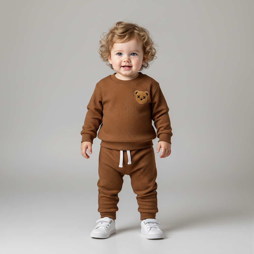 Gerippter Trainingsanzug mit Waffelmuster und Teddybär-Print