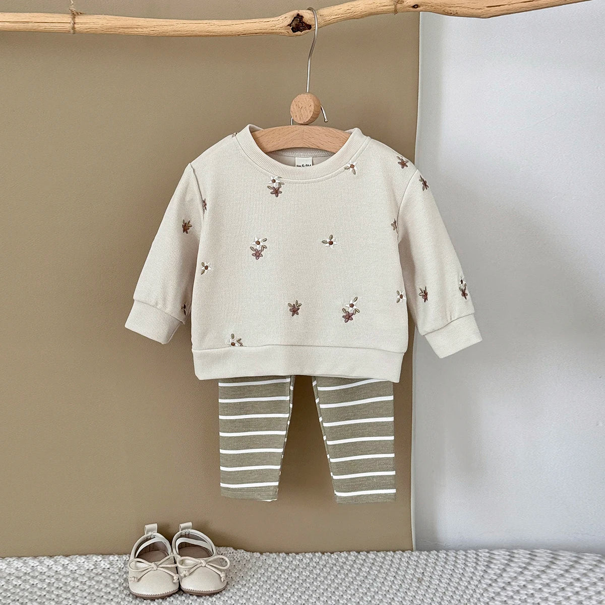 Floral Embroidered Top Striped Pant Set